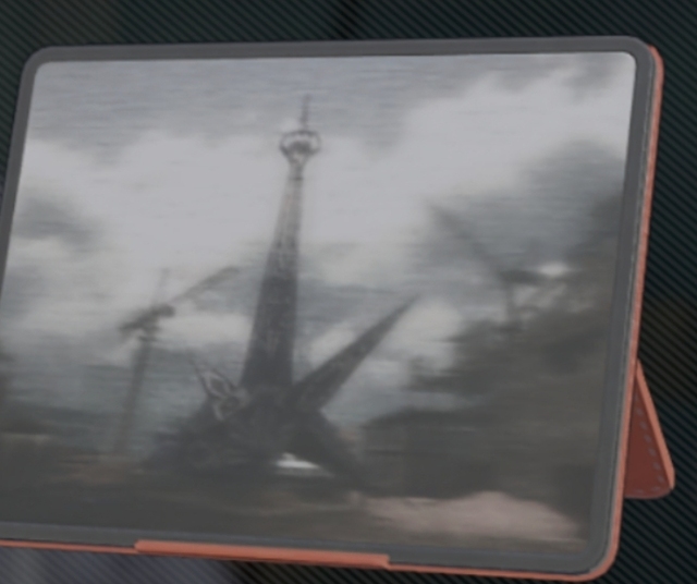 玲发送至格丽丝平板电脑低分辨率图片,是原型机所在地尚未被空洞吞没拍摄的照片,在图片上隐约看到一座塔