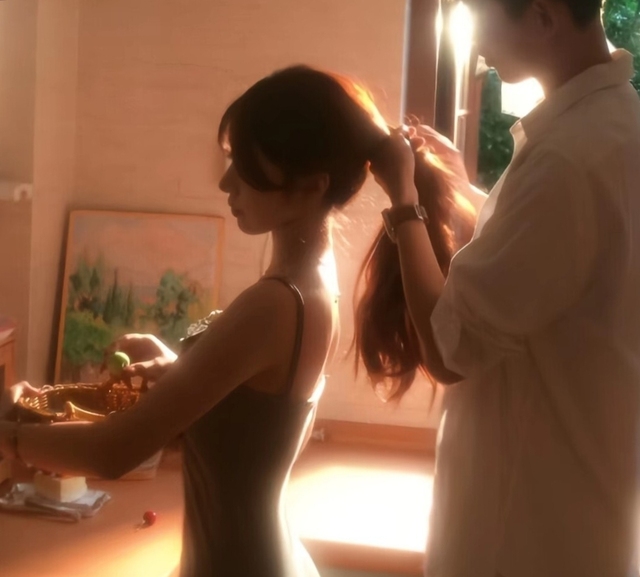 他的手指轻柔而细心,每一次穿过发丝,都像是在编织着我们之间的默契。镜中的我们,眼神交汇,无需言语,那份默契和深情在空气中缓缓流淌。他的动作不急不躁,每一个细节都透露出他对我的关怀和爱护。