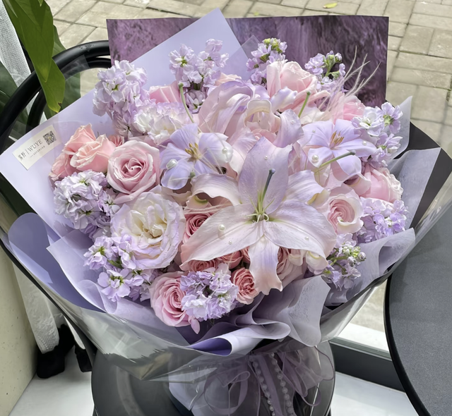 先去了花店去了妈妈最爱的百合花还是用她最爱的紫色搭配的!