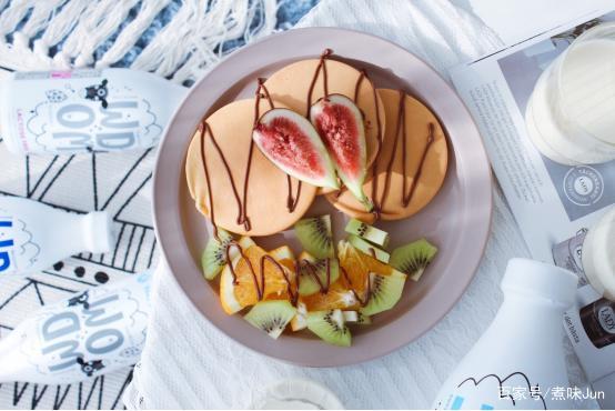 面前是一份果酱松饼水果早餐,在配上一杯温热的牛奶。