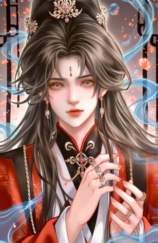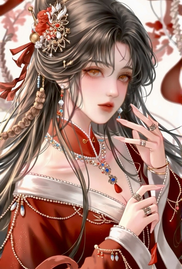 她乌黑的发丝间点缀着“精心”装扮的精美饰品,如星辰落入了夜幕。她的橙色眼眸深邃而悲愤,也透出一丝难以言喻的无奈和绝望。手腕上,多枚戒指与手镯交相辉映,或金或银,有的镶嵌着晶莹剔透的宝石,有的雕刻着繁复的花纹,或许平常来看是一些繁琐的点缀,但现在来看,更像是命运的枷锁……