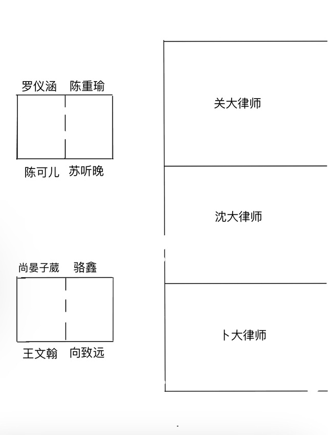 卜亚楠好,那我们现在已经参加完办公室了,大家稍微休整一下,将你们刚才的庭审笔记,整理一下,提交上来,然后我们十五分钟之后在二号会议室集合。