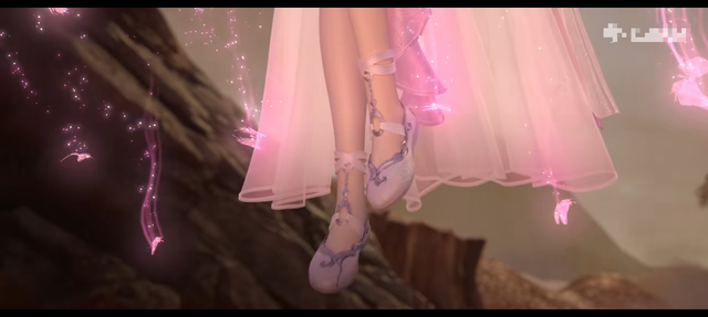 只见一位仙子伴随着粉色的蝴蝶缓缓地从一处石头后面飞了出来