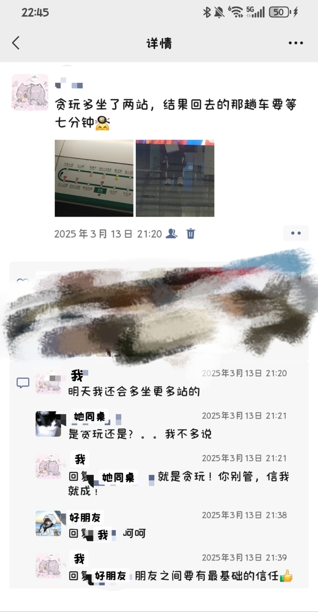 我还以为她没赶上呢,就自顾自靠在车厢上和朋友发语音了