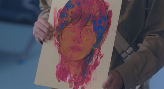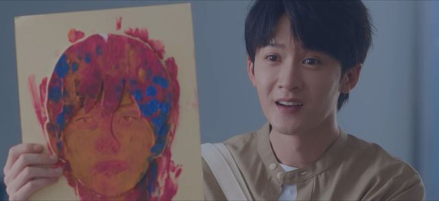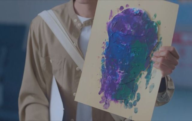 小鹏嘴角上扬慢慢画着第二幅画,快画完时小鹏用蓝色颜料在头发上面画了一些,笑容也消失了。