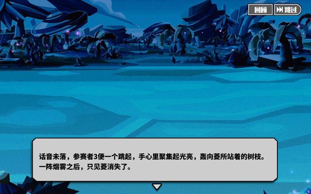 话音未落,参赛者3便一个跳起,手心里聚集起光亮,轰向菱所站着的树枝。一阵烟雾之后,只见菱消失了。