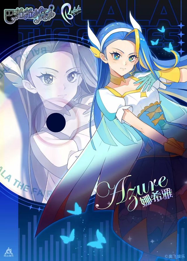 魔仙状态下的她穿着一身华丽的魔法裙,裙摆如同波浪般层层叠叠,蓝色和黄色的配色让她看起来既高贵又充满活力。裙子上装饰着精美的图案,随着她的动作闪烁着光芒。手臂上戴着金色的护腕,手中握着一根魔法杖,杖身细长,顶端镶嵌着一颗闪耀的蓝宝石。