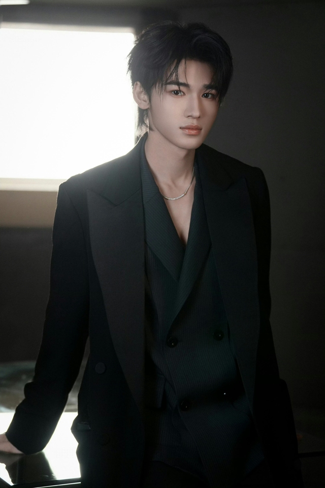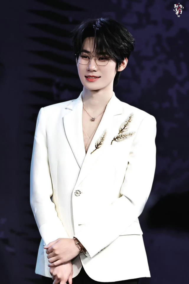 贺峻霖同样身着的深色西装,点缀以细密亮片,尽显低调奢华。内搭纯白衬衫,领口白边勾勒,更添清新利落。发型整齐,目光沉稳,姿态自若。贺峻霖的这身装扮细节都透露着从容不迫的绅士风范。