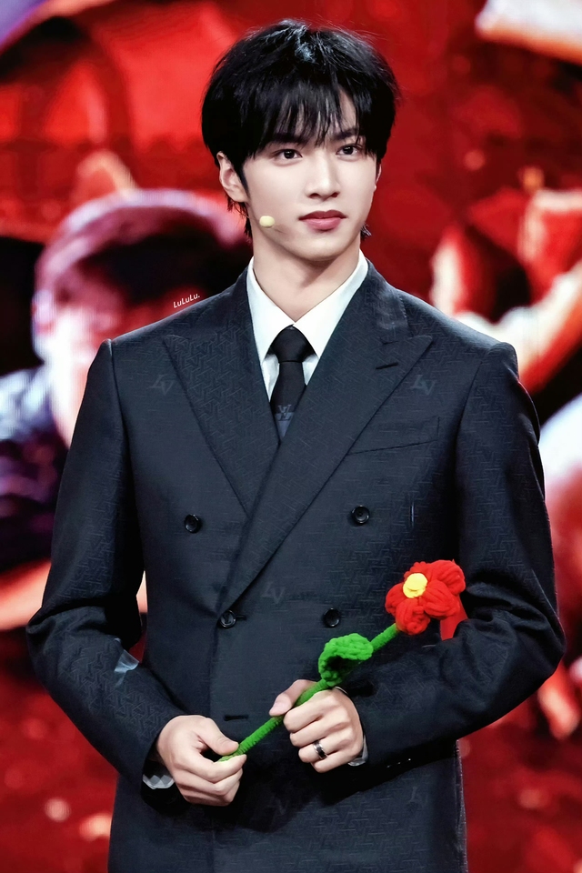 刘耀文身着的传统领带黑色西装,西装剪裁合身,细微图案增添层次感,搭配他作为模特专业的表情管理,更显庄重。左手轻握绿红交织、黄心点缀的花朵,为整体造型添一抹生动。右手戒指闪耀,指节修长。刘耀文宛如舞台中央的焦点,散发着不可言喻的魅力与自信。