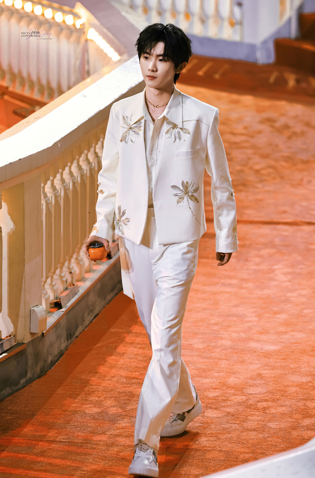 马嘉祺身着的白色西装,绣以金色植物图案,行走间尽显优雅时尚,如王子般。黑发整齐,刘海轻垂,手持橙色小物,添一抹灵动。红毯与灯泡光影交织,映衬出他的高贵气质。每一步都踏着精致与高雅,马嘉祺以这身装扮,令人眼前一亮。