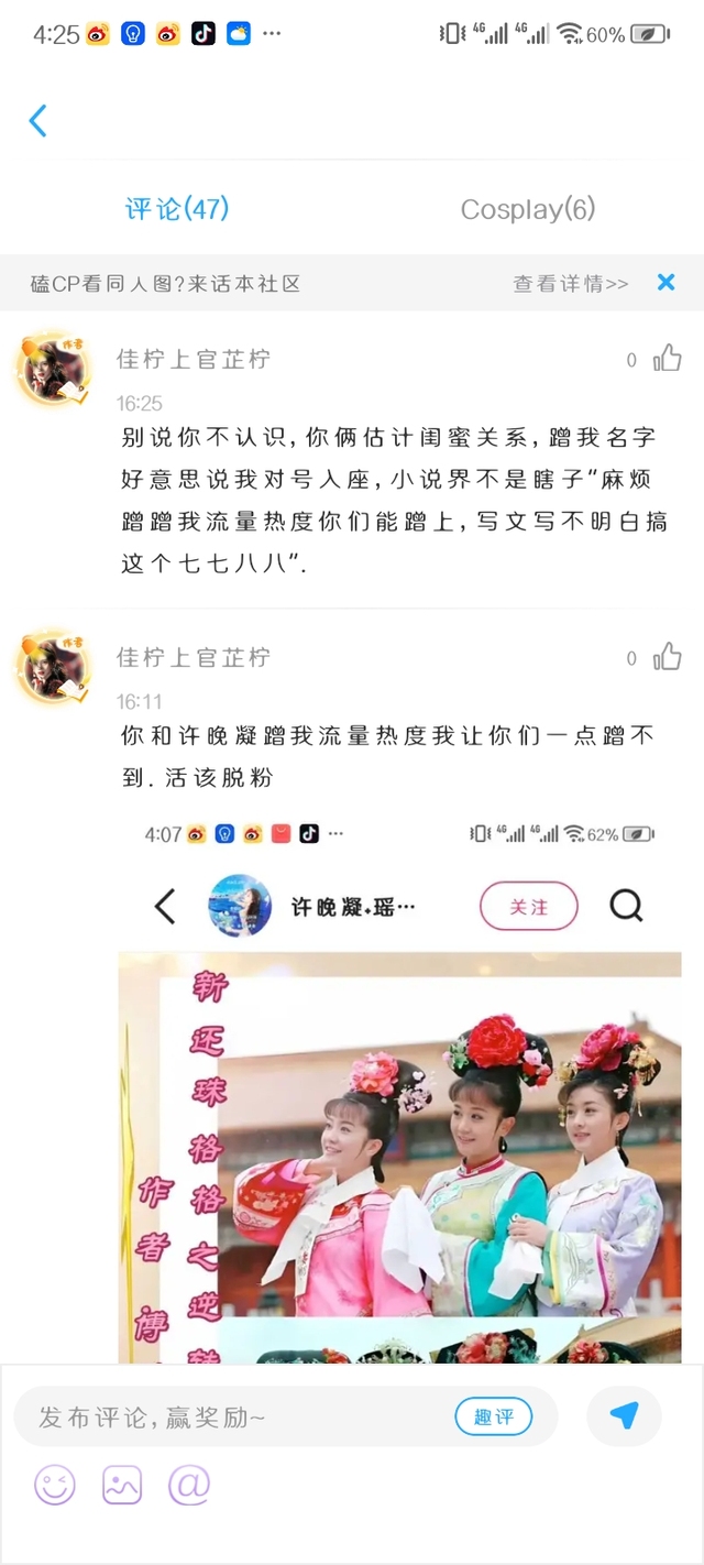 上官芷晗(佳柠徒弟)还有番茄平台也是第一,你敢不敢拿黑马名号作者实力和能力,不敢吧!你心虚见你也不是啥好玩意儿跟许晚凝一个德行。