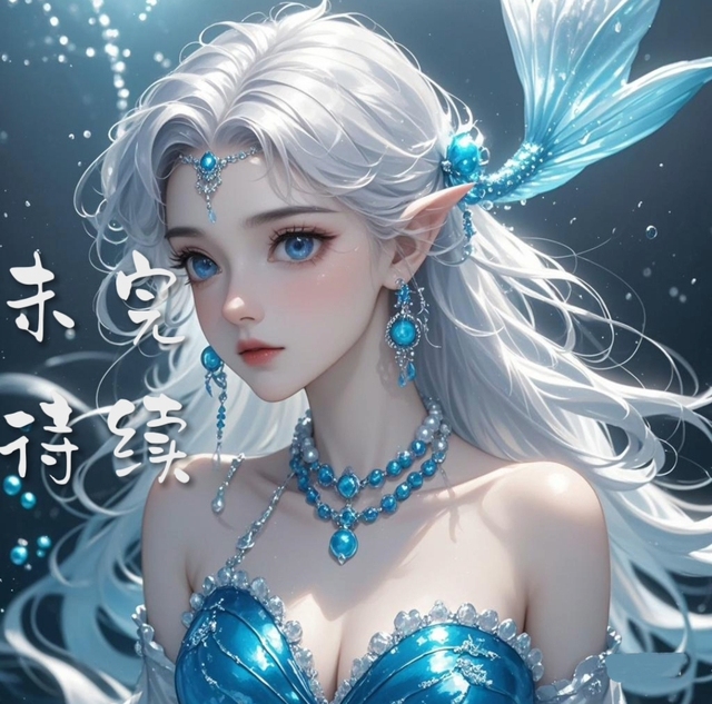 她原本黑色的头发此时变成了白色,耳边带着蓝色鱼尾状的头饰,一双蓝色的眼睛,深邃得仿佛藏着一片无尽的海洋,平静而深思的神情里透着一丝神秘的气息