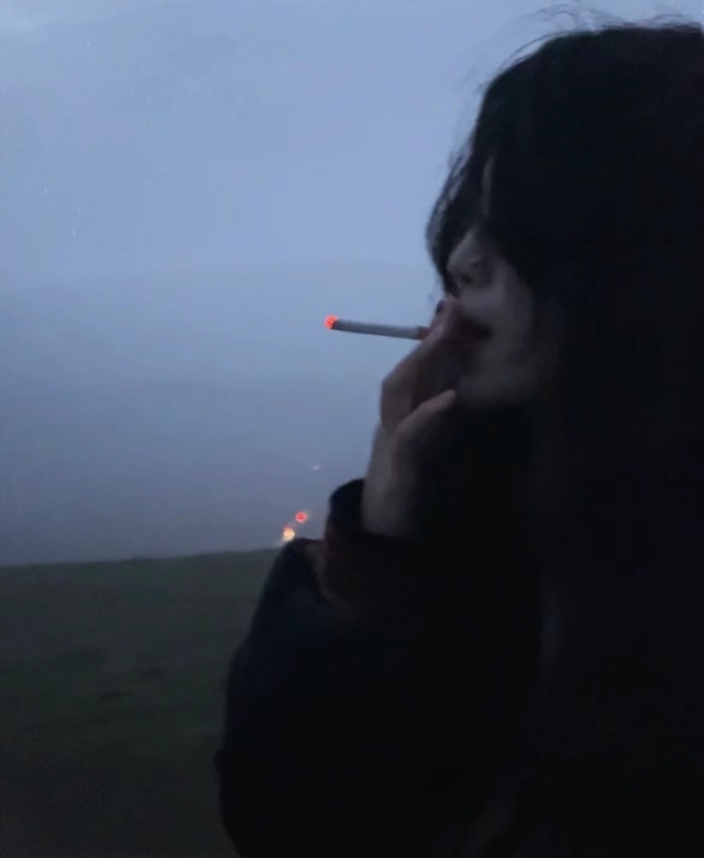 凌晨的山坡上站着一个身着黑色风衣的女生,乌黑的长卷发随风飘扬,修长的手机刁起吸烟,红唇轻抿烟雾飘散