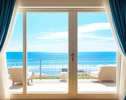 绕过屏风就是宽敞明亮的客厅,光洁如镜大气磅礴的落地窗,正前方古风外墙被玻璃围墙替代,将海景尽收眼底。