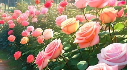翠竹迎客,围墙上绽放的蔷薇热情,庭院大门打开进入院子荷花、荷叶汀步石醒目,两侧种满各色玫瑰。
