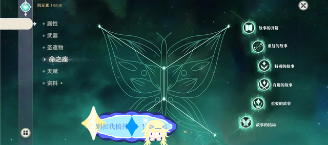 命之座6:为自身提高75%的风元素穿透,为全队提高全元素穿透(不包括自己),并为全队提高45%的全元素免伤(包括自己)。在元素战绩启动期间,抗打断提升至100%,攻速提升50%,蓄力时间缩短25%