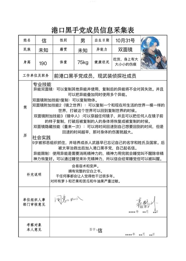 福泽谕吉大家好,我的异能是「人上人不造」只能对自己的部下(侦探社社员)发动,使之获得对自身异能的抑制力和调控力。