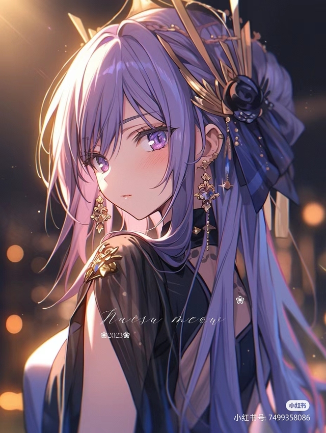 宛如从梦境中走来的仙子,散发着令人屏息的绝美气质。她最引人注目的是那一头如梦似幻的长发,由深邃的紫玉色逐渐过渡到浅淡的紫罗兰,仿佛凝聚了夜空与晨曦之美,在光线下流转着神秘的光泽。