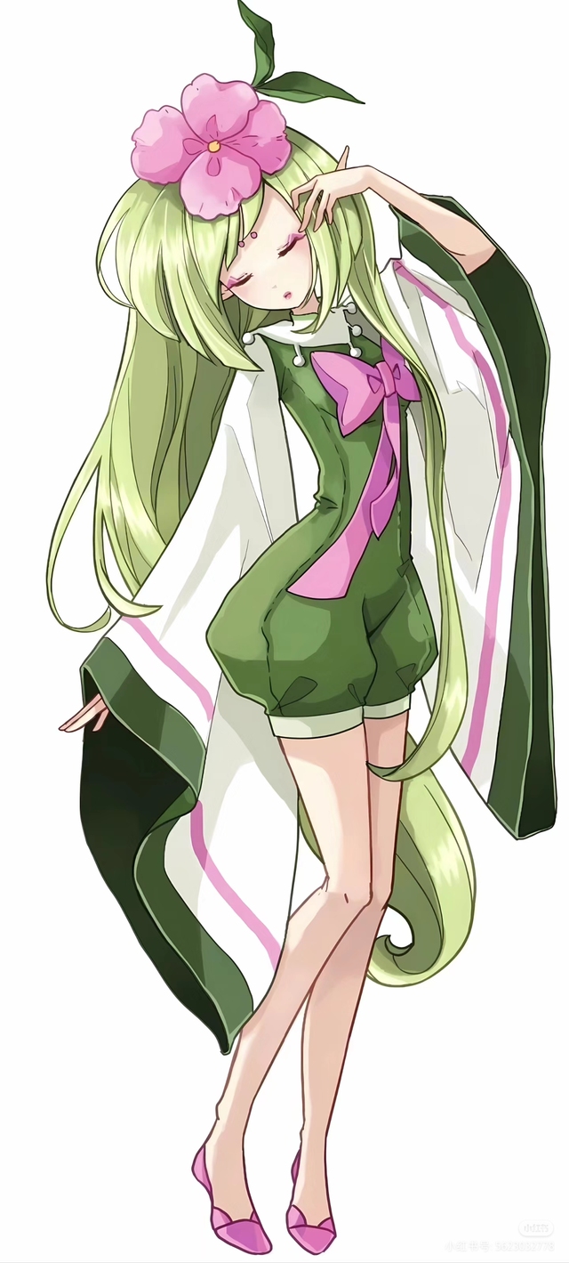 宛如一朵盛开的绿意之花静静伫立。那一头及腰的绿色长发如翠玉般温润,在无形的微风中轻轻摇曳,几朵粉色的小花点缀其间,仿佛是春天遗落在人间的梦。她身着一袭绿白相间的连衣裙,那细腻的褶皱仿佛是春风轻抚过的湖面,腰间系着的粉红色蝴蝶结宛如一只欲展翅飞翔的蝶。她的神态安详而温柔,嘴角挂着一抹若有若无的微笑,像是正沉浸在一个只属于自己的美好瞬间。在这片纯白的世界里,她就像是一抹最灵动的色彩,既独立又和谐,散发着一种清新脱俗的气息,让人不禁想要走进她的心灵世界,探寻那份宁静背后的秘密