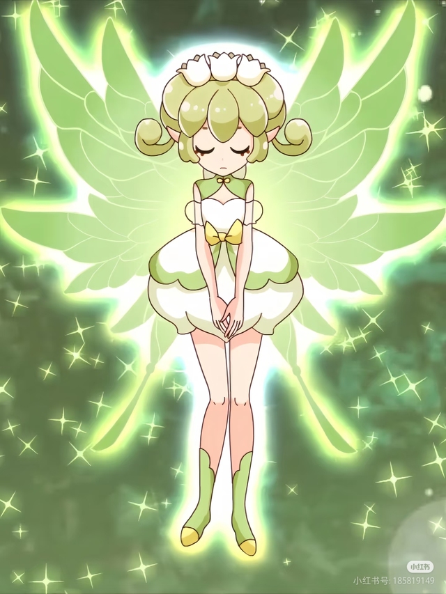 在一片幽谧的深绿光晕中,她宛如从梦境中走来的精灵。翠绿色的长发如瀑般垂落,与身后那对轻盈剔透的羽翼相互映衬,仿佛是大自然最精致的杰作。一袭白色连衣裙纯净无暇,在微光中轻轻摇曳,更显出她的超凡脱俗。此时的她正闭目凝神,双手合十置于胸前,头顶精巧的花冠散发着淡淡的光芒。她似乎正在与某种神秘的力量对话,又像是沉浸在自己的内心世界里。那宁静而祥和的姿态,让人不忍打扰,只能静静欣赏这如诗如画的一幕。在这片充满梦幻色彩的空间里,点点星光闪烁其间,如同星河坠入人间。整个画面散发出一种空灵之美,令人不禁联想到古老传说中的森林精灵,正守护着这片静谧而美好的天地