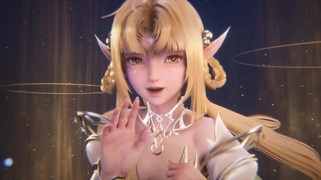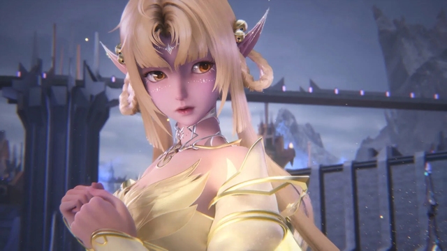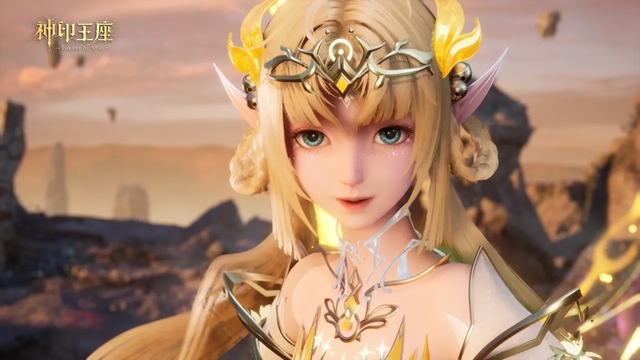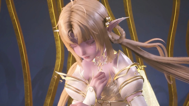 龙雅婷耳朵尖尖的,水绿色的眼眸,一袭蓝色长裙,金发缓缓飘扬,多了几分曲折,就像是大波浪一般在背后散开。四对淡金色的透明翅膀与两对淡蓝色翅膀。绝色的容颜带着一种神秘的诱惑,额头上有一道长约一寸的金色光线