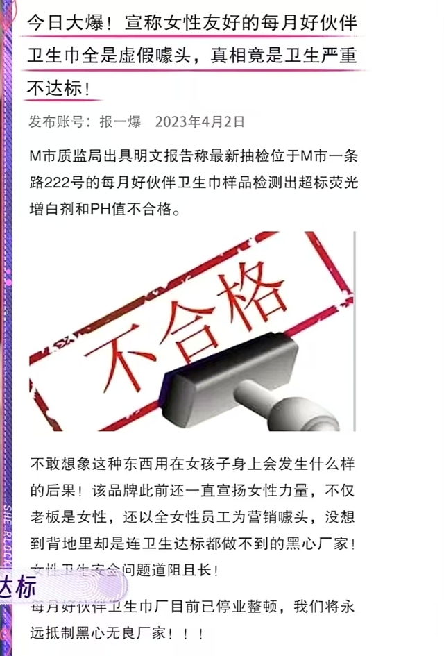 千可莹痛经,并获得信息每月好伙伴卫生巾由最火的账号报一报上曝光,说有产品卫生问题。