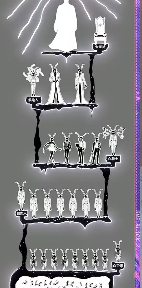 戚薇这就是新乐园的一个晋升体系吧。那个餐桌的盘子里爬了很多蚂蚁。所以餐桌的主位的人就是大家长。