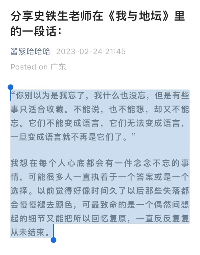 所以,人生在世,有很多喜欢我的人,也有很多讨厌我的人,还有很多根本就不认识我的人。我现在就觉得无所谓了,我的本心找回来了,能交流交流,不能交流保留,也不是什么大事。