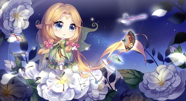 远古魔神殿,奇怪的白色花朵默默开花,里面诞生了一只花灵,12心器围绕她旋转,棕色短发,绿色的裙子,就像花朵本身