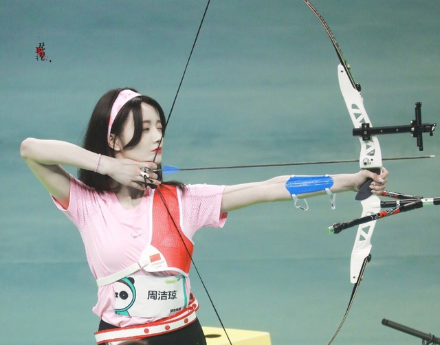 周洁琼做出射箭的动作
