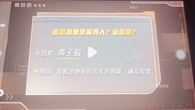 小巧妹妹:“接下来的能力测试中是增强各位探员的一个判断能力,在录制之前,我们也给到各位探员发出了一些问题,并收集到了各位探员的答案,经过调研,我们选出了每个问题最有趣的答案,那么接下来请探员们回答出这个答案的主人是谁”