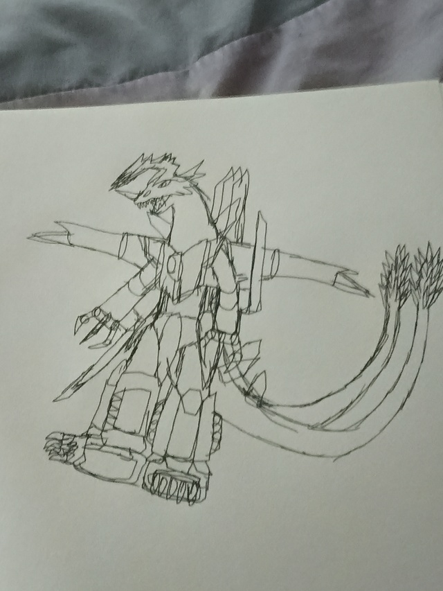 原本的坦克底盘消消失取而代之这是两个机械腿脚,腿部还有隐藏的可以发射导弹的结构,脚有履带的造型可以滚动,背后长了三个炮管和众多水晶状突起可对可以伸缩自如机械翅膀,胸前成有一对护甲,还有一个能量指示器,双臂呈臂炮的造型拥有十分恐怖的机械爪,此处安装这可以切断一切的星魔剑平时都是隐藏模式要攻击的话都会展开战斗模式,头部也变得非常恐怖二长一短的角变的十分有攻击感,尾巴也变成两个拥有更好攻击,这就是恐龙要塞强化型,战争大超兽:EX恐龙战争