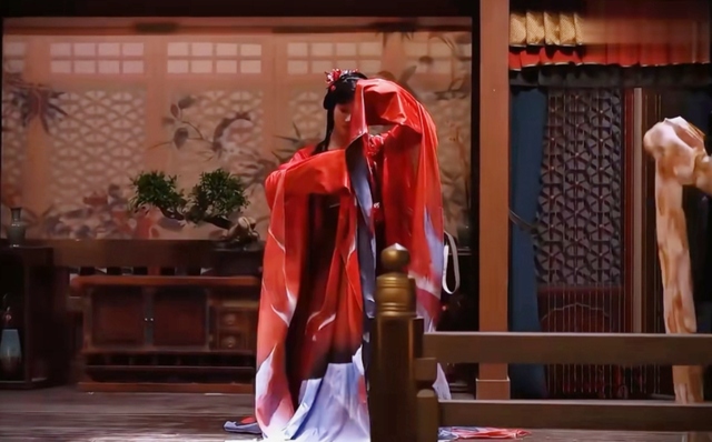 一位身着红蓝相间舞衣的女子在台上翩然起舞,裙裾随风轻扬,长袖如流云般舒展。