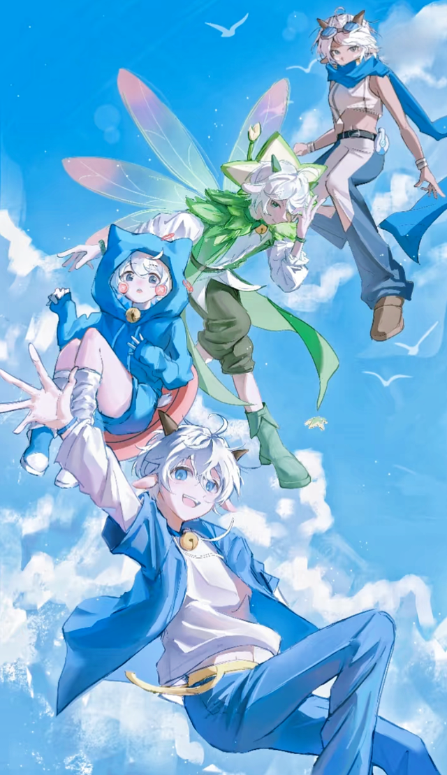 风华正茂的喜羊羊;安静平稳的布拉喜;自恋却强大的喜花花;还有那随风肆意的喜儿;四者在天际间展翅翱翔。他们的身影划过长空,仿佛天地之间的一切都因他们的存在而焕发出生机。白云缭绕在他们身旁,为那本就熠熠生辉的身影平添了几分柔和与瑰丽的色彩,使得他们的轮廓愈加鲜明动人