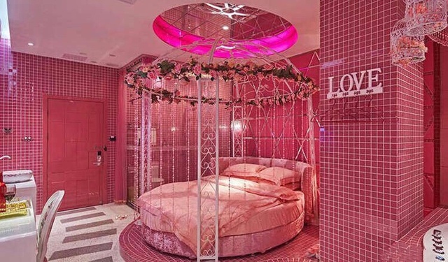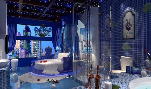 这间充满了浪漫风情的房间里,星空、蜡烛、香槟、花瓣应有尽有,没有最浪漫,只有更浪漫。