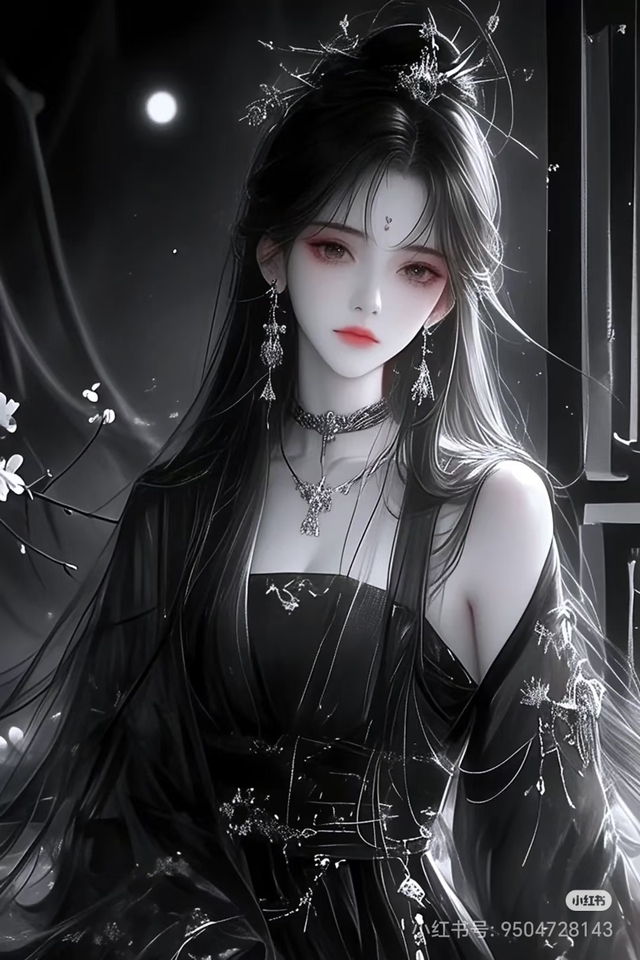 晨光熹微,一缕清辉透过雕花窗棂洒落在她身上。她端坐于铜镜前,乌黑的青丝如瀑般垂落,发间隐约可见几朵白色梅花簪子点缀,平添几分雅致。今日未施重彩,只淡淡扫过蛾眉,点上朱唇,却已美得不可方物。那袭黑色暗纹汉服,衣袂随风轻摆,袖口绣着银色花纹,在晨光中若隐若现。她抬手抚了抚鬓角,动作娴静优雅,宛如从古画中走来的佳人。窗外腊梅正盛,暗香浮动,几点白梅悄然飘落,轻轻落在她的肩头。这一刻,时光仿佛凝固,整个天地都为这绝世容颜而屏息。远处传来几声鸟啼,更显庭院深深,静谧安详。