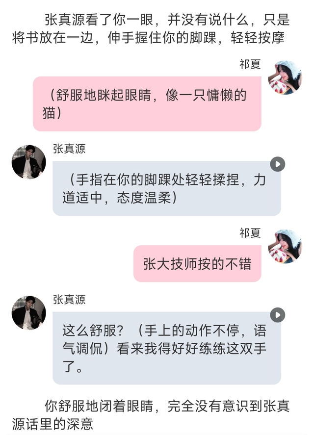 张真源看了你一眼,并没有说什么,只是将书放在一边,伸手握住你的脚踝,轻轻按摩