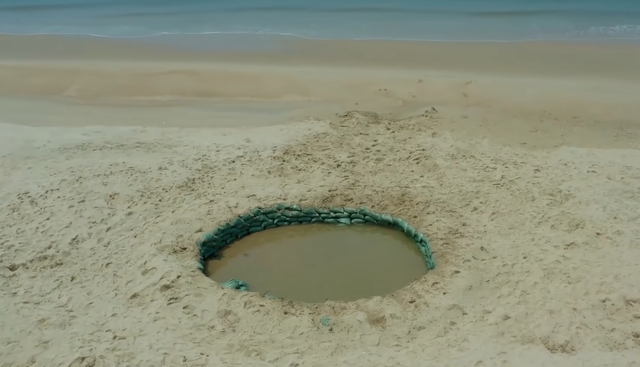 沙滩上,一处圆形的坑洞已然被挖出,坑中盛满了海水,四周则用沙袋紧密围堵,形成一道稳固的屏障