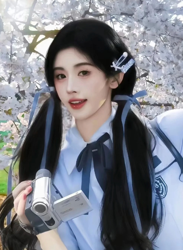 扎着双马尾手提着一部相机,甜美的风格让人移不开眼睛