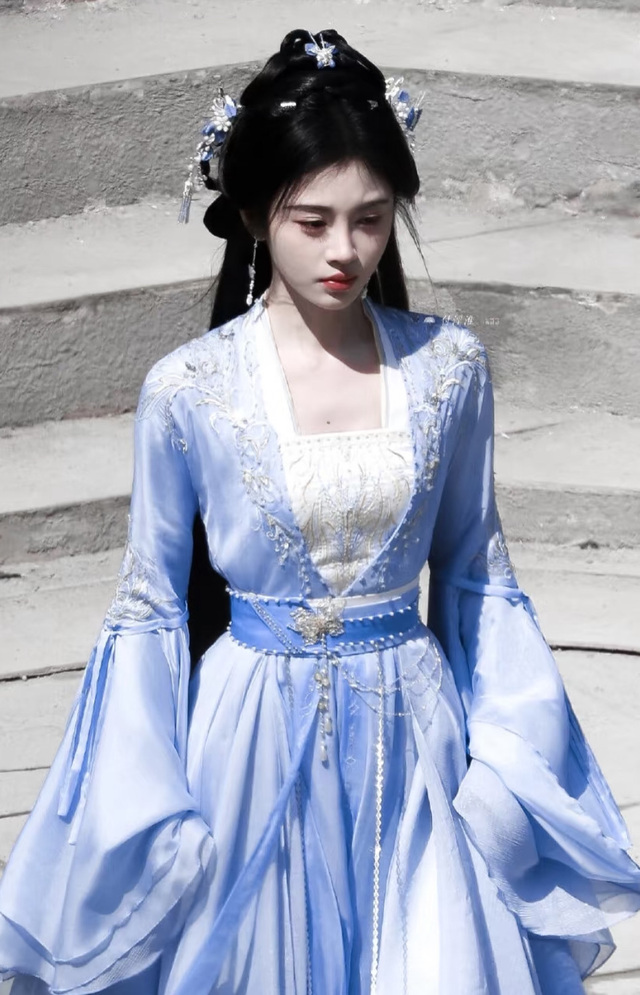 身着一身浅蓝色纱衣,肩上披着白色轻纱,微风吹过,给人一种飘飘欲仙的感觉。 一头青丝散散披在双肩上,略显柔美,未施一丝粉黛。