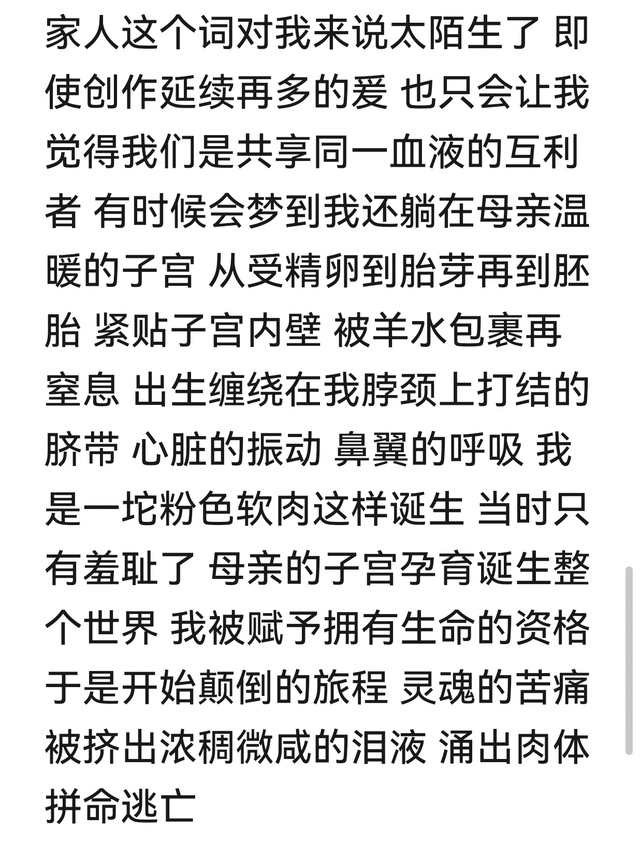 在雨橦还是一坨粉色软肉时,被熟悉的羊水包裹着,在脖颈上打结的脐带,心脏的振动,鼻翼的呼吸。血淋淋的出生前经历的,午觉梦见的,还会回味的,一些零散的记忆,从受精卵到胚芽再到胚胎。