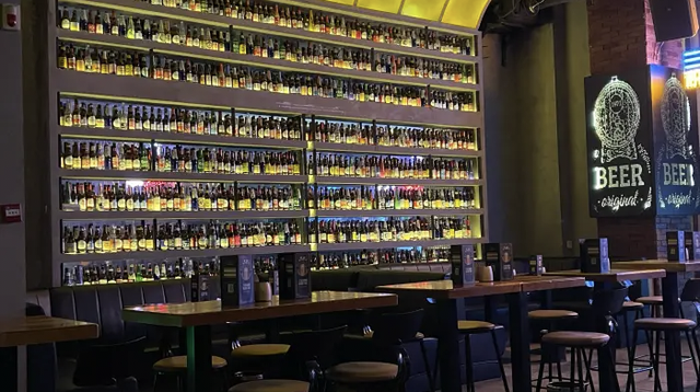 姜垣的门店跟想象中的酒吧样子区别很大,用酒馆来形容可能会更恰当,因为时间还太早,店里根本是空无一人的状态,整面墙的酒在这样的环境下,远看像一本本摆放整齐的书