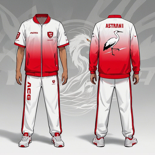 裤脚上有红色刺绣,绣着“ACG”字样。外套轻薄防风,整体以白色为主,红色作为点缀。背后有一个大尺寸的白鹭展翅图案,视觉冲击力很强。队服用有透气、吸汗的功能性面料,修身剪裁,摸起来很舒服。