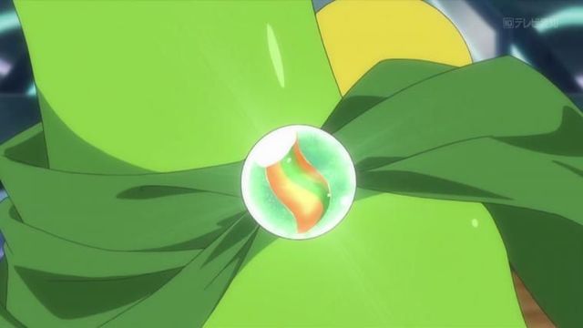 蜥蜴王的身躯被虹彩所包裹,它的样子也在虹彩之中开始了迅速的转变,被虹彩包裹的蜥蜴王用爪子抓住了冲来的mega烈咬陆鲨,令其难以动弹。待虹彩退去,眼神变得锐利、胸口处的利叶延伸开来、尾巴变成了簇状龙尾的蜥蜴王出现在月渡的视线中。其名为mega蜥蜴王。