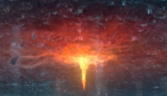 乾坤圈从项圈,变成手镯,哪吒额间的火纹泛光,熊熊烈火他从火中拔地而起,用双手撑住冰坨。