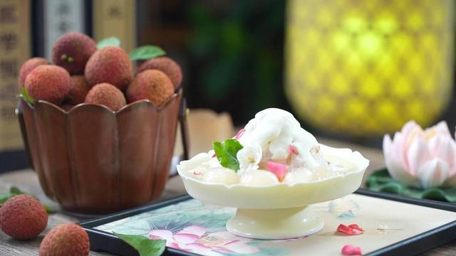 凝霜的冰粉山托着琥珀色荔枝酥酪,在叶片的掩映下,红果如星子坠入雪原,冰雾裹挟着荔枝的甜香袅袅升腾。
