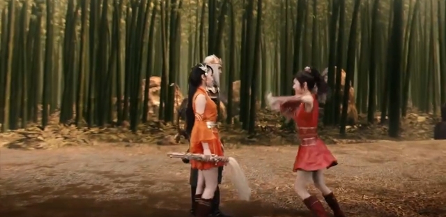 真水无香和小雨妖妖被一群人围攻着。真水无香一只手搂住小雨妖妖的腰,两人飞了起来