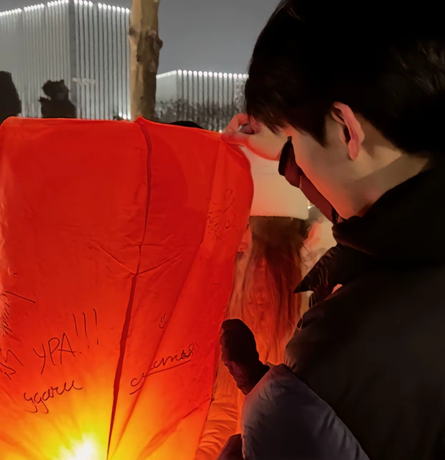 蒋鹏翰与胡竟接过笔,在孔明灯上郑重地写下了自己的祝福。当孔明灯缓缓升空,胡竟仰望着它消失在夜幕中,嘴角带着一抹浅笑。