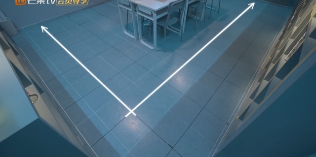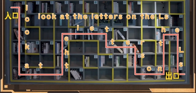 蒲熠星在贴有失物招领柜中取出文件夹,按照书架边画的黄色线条走迷宫。