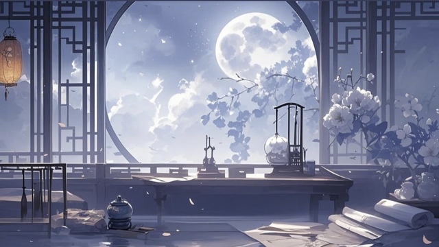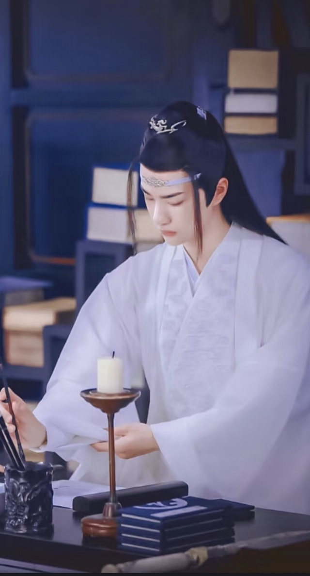 一身白衣的蓝湛端坐于书案之前,姿态如松般挺拔又带着几分清冷。他微微垂首,修长的手指握住毛笔,笔尖轻悬于宣纸之上,不知在写着些什么。